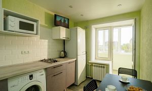 Компактная кухня оборудована современной мебелью и всей нужной для длительного проживания бытовой техникой. В распоряжении гостей квартиры полный комплект посуды и кухонной утвари на четыре персоны, чтобы чувствовать себя как дома и готовить привычный рацион по своему вкусу.