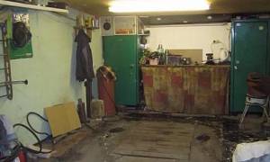 Кирпичный гараж со смотровой ямой, металические ящики для инструментов.