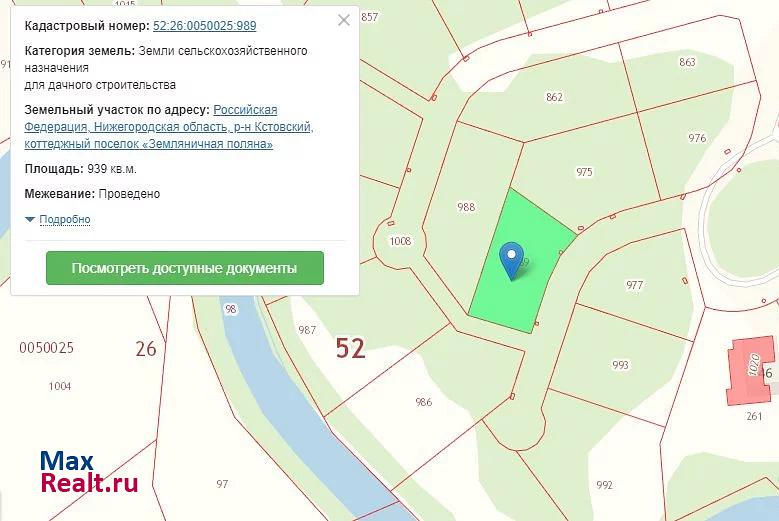 Продам земельный участок площадью 9,39 соток в курортной зоне Нижегородской области "Зеленый город"-коттеджном поселке "Земляничная поляна". Газ заведен на участок, электричество проходит по границе. До участка асфальтовая дорога. Прекрасное место для загородной жизни, с одной стороны поселок граничит с рекой Кудьмой (оборудован свой пляж), с другой - лес Зеленого города.Интеллигентные соседи. Коттеджный поселок закрытого типа, круглосуточная охрана. Кадастровый номер: 52:26:0050025:989