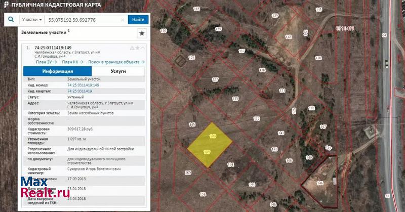 Продам земельный участок с кадастровых номером 74:25:0311419:149, площадью 1097 кв. м. по адресу: г. Златоуст, ул. им. С. И. Грицевца, №4