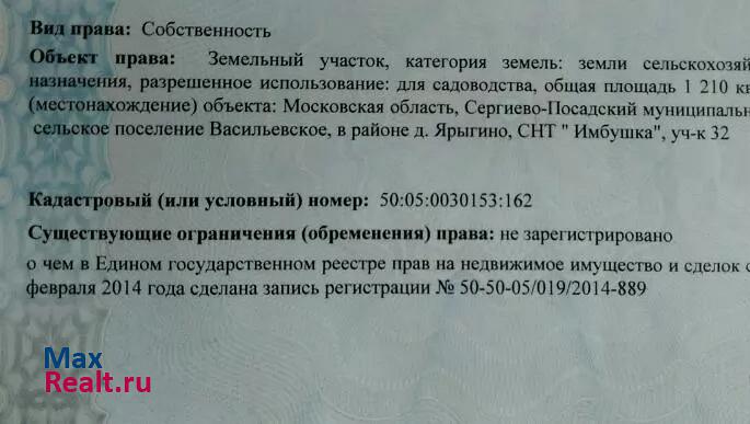 земельный участок расположен вблизи деревни Ярыгино (по Ярославскому ш. в 70км. от МКАД или в 17 км от г.Хотьково Моск.обл.)
